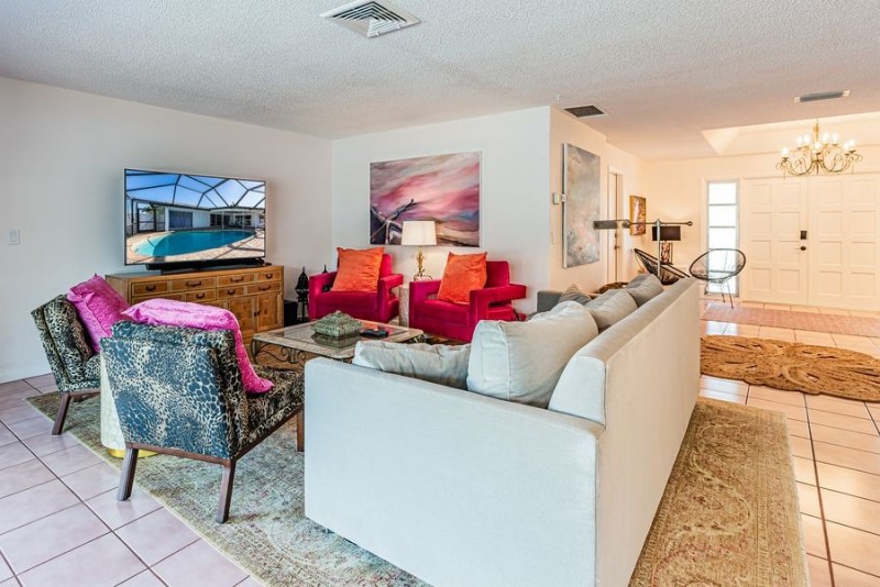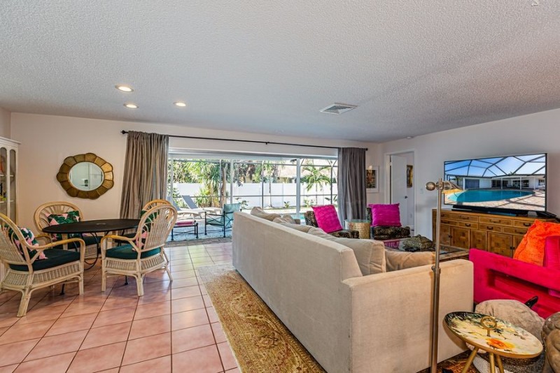 Marco Island is a magical place where you can put aside life’s demands and enjoy a relaxing holiday. Filled with original art and character, this 4 bedroom, 3 bathroom island getaway offers just that. Luxuriate in the heated salt water pool under a fully enclosed lanai and private fenced in backyard or splash in the waves at Tigertail Beach a few minutes away. This home features a Master King bedroom with ensuite bathroom and walk-in closet with pool view and a 55 inch tv. The other 3 well appointed bedrooms provide privacy and fine linens. Located down its own wing and sharing a private bathroom with shower, The Shell Room offers a sumptuous King bed and The Mermaid Room has a cozy Queen bed with tv. The Aqua Room offers another Queen bed, 55 inch tv with full 4 piece washroom adjacent to it. Lounge in front of the 65 inch tv with soundbar in the living room and catch up on your latest series or chill outdoors in the lanai with Tiki Mahalo and a good book. The house has WiFi throughout and all TV’s have streaming capabilities. New stainless steel appliances in the kitchen make it easy to dine in or grill on the Weber and the dining table seats 8. Or skip the dishes completely and try the great restaurants close by! A perfect retreat for a family or group of friends.