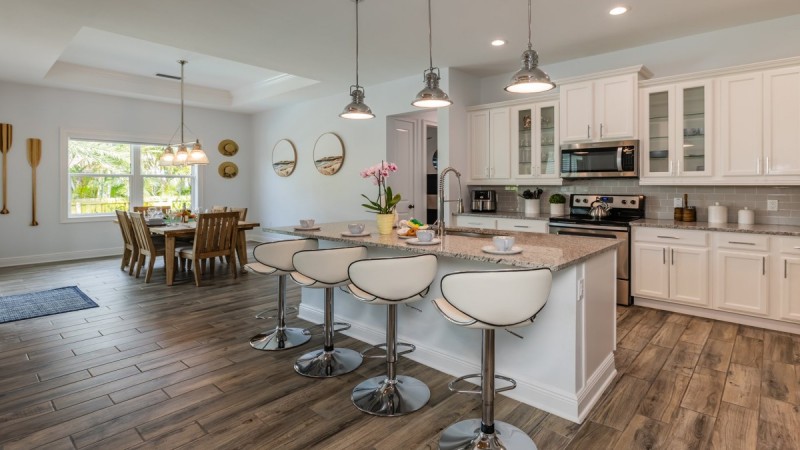 Beachy and beautiful, this three-bedroom home is the perfect way to experience Marco Island. This recently remodeled home features designer finishes from floor to ceiling, including luxury vinyl plank flooring, high ceilings, high-end furniture, and an open-concept floor plan made for entertaining.