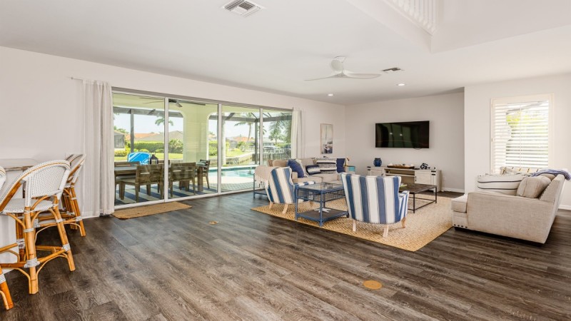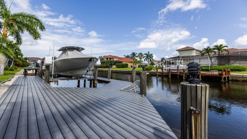 The home has a heated swimming pool with great water views and also has an outside pool bathroom. Also, a bonus side yard to use along with a tiki hut complete with a paver surface and 6 adirondack chairs. The tiki hut is a great place for happy hour or morning coffee. Upstairs is a bonus deck with lounger chairs and a bar height set of adirondack chairs. Great sun set sky views and a relaxing bonus space. There is a large, oversized dock with a floating dock, swim platform is a large plus to launch two included kayaks. Ample space to tie up a rental boat is available. Prior notice must be made to use dock tie up. No boat lift is included.
