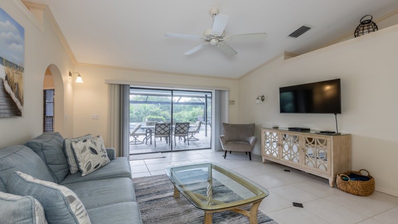 Lovely three-bedroom two-bathroom with pool and spa, and a short distance to Tigertail Beach access. This vacation home is unique in that it backs up to the Marco Island Eagle Sanctuary so you might catch a glimpse of the two bald eagles and possibly their hatchlings as well as many other birds and wildlife. Decorated in cool coastal colors this home is perfect for a family vacation. The Living room has a comfortable sofa, two armchairs, and a flat-screen TV.