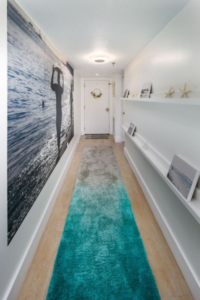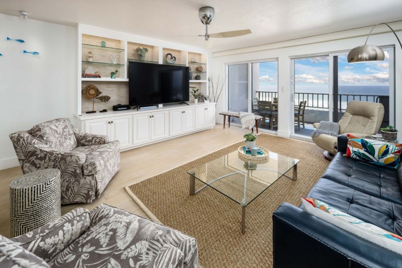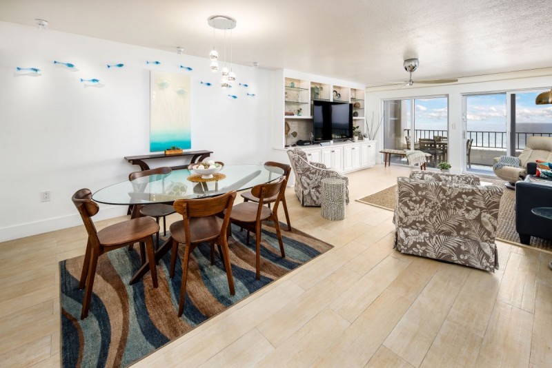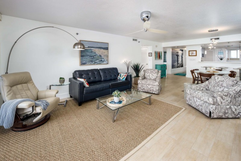Remodeled from top to bottom, this gorgeous unit boasts plank tile flooring throughout, spacious bedrooms, completely remodeled bathrooms with top of the line fixtures, impact windows, quartz countertops and new stainless steel appliances in the modern kitchen. Every aspect of Surf Dweller 703 is upgraded for the true upscale beach vacation home. A Google mesh provides flawless connectivity to Wi-Fi and the internet. Three smart TVs are in the unit with a huge 75” in the living room and a 65” located in the master bedroom. A king bed awaits guests in the master bedroom while a luscious queen size bed awaits the others in the guest bedroom. While the master houses an en-suite private bathroom, the guest bathroom is just outside the second bedroom and across the hallway from the kitchen.