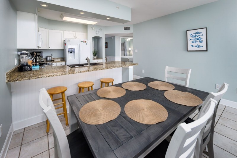 Welcome to Unit 1006! Just steps away from the water! This quaint 2 bedroom, 2 bathroom unit offers glorious views from the balcony which is accessible via the living room AND master bedroom. You can enjoy your morning coffee at the breakfast bar seating in the kitchen, the dining room table, OR outside on the balcony table. The master bedroom is directly on the waterside and contains a lovely desk as well as a mounted TV for all your viewing pleasure. The master bathroom has an updated walk-in shower and there is a stacked washer and dryer inside the unit. The second bedroom offer room for two more guests with a queen bed! This unit has everything you need for the perfect vacation!