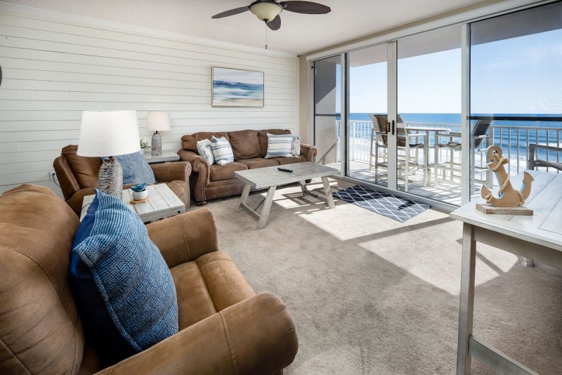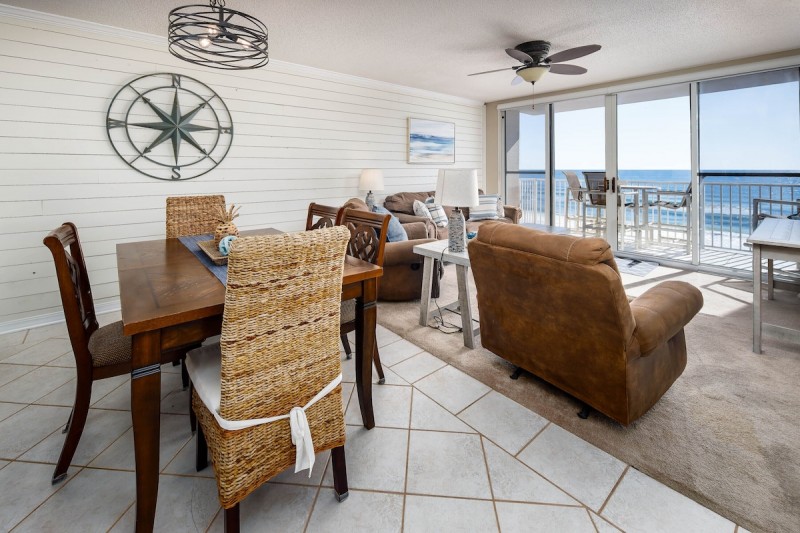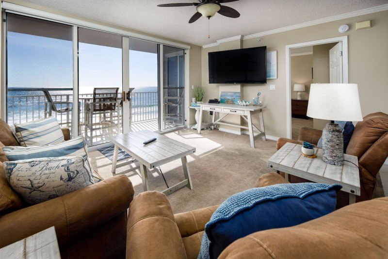 Located on the 6th Floor near the center elevator, you will experience amazing views whether inside the unit through floor to ceiling windows with sliding glass doors from the living room and master bedroom, or on the balcony relaxing on the outdoor furniture (high-top table and 4 comfortable chairs) and enjoying the incredible views of the sunrise and sunset! Interior features 3 bedrooms; beach front master bedroom has incredible views through a large gulf facing window and sliding glass door, plenty of storage space for your belongings, and private full bathroom connected. The second master bedroom has views of Okaloosa Island, the intercoastal waterway, and Ft. Walton Beach, large TV, and private full bathroom connected. Third bedroom is roomy with plenty of storage, TV, and shared access to the main full bathroom. The open floor plan makes the unit very spacious and great for entertaining. The rental includes access to a heated pool and hot tub located on a large pool deck just steps away from the beach, exercise room, outdoor grills and easy access to the beach via a private walkway, where you’ll enjoy beach service including 2 beach chairs and an umbrella from March – October.