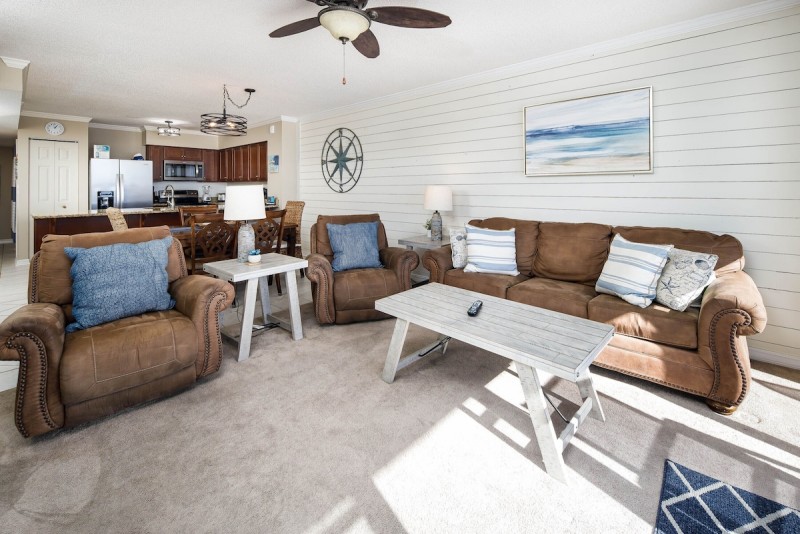 The sleeping arrangements in this unit are as follows: master bedroom - 1 king bed, 2nd bedroom - 1 queen bed, 3rd bedroom – 2 twin beds. Sleeper sofa in the living room. This unit sleeps 8.