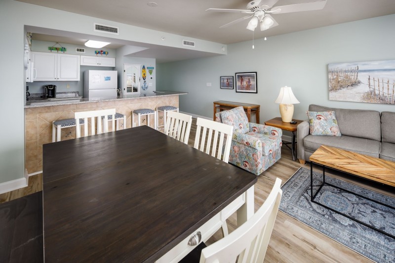 THE SLEEPING ARRANGEMENTS IN THIS UNIT ARE AS FOLLOWS: MASTER BEDROOM - 1 KING BED, 2ND BEDROOM - 1 KING BED, BUNK BEDS IN THE HALLWAY, SLEEPER SOFA IN THE LIVING ROOM. THIS UNIT SLEEPS 8.