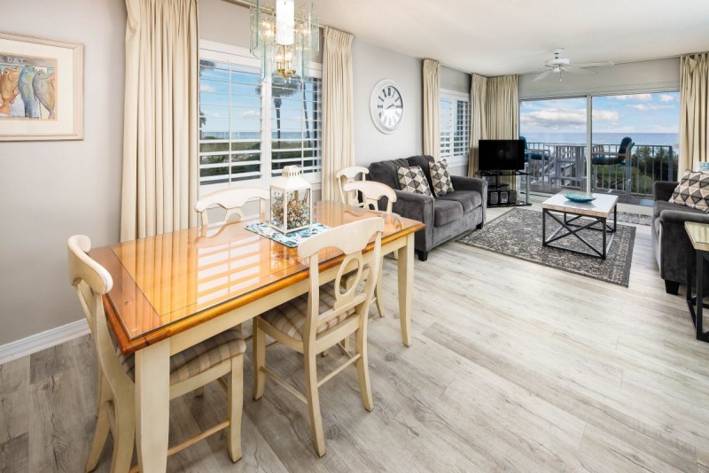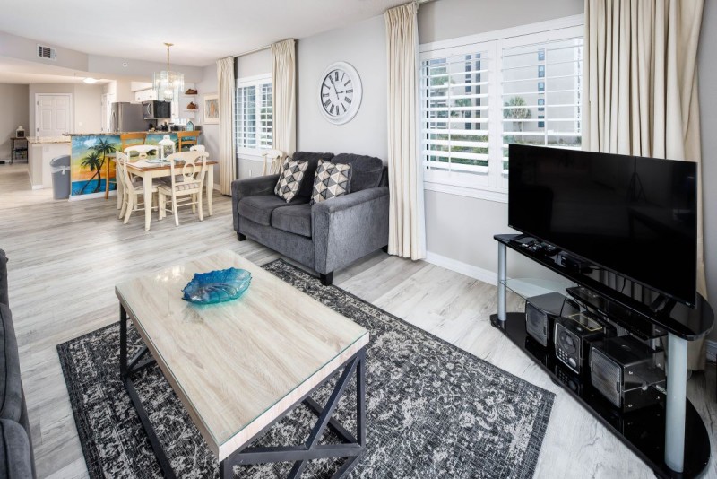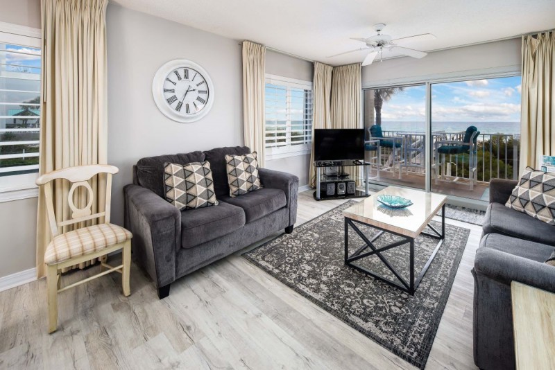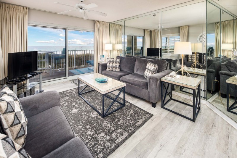 This first floor unit is an incredible space that has tons of touches of home. Each room has its own coastal flair, including brightly colored tropical fish in the master bedroom/bath, lightly colored seashells in the guest bedroom/bath, and a palm tree mural in the dining area. This unit has an assigned covered parking space. With two bedrooms and a sleeper sofa, this non-smoking unit can accommodate up to 7 guests. The wall mirror in the master bedroom helps fill the space with color. A full-size kitchen is complemented by a large island cabinet/countertop. A full-size washer and dryer set is also available in the unit. Three large windows and wall mirrors in the living room come together to surround the space with golden sunshine, white sands, and emerald-colored waters - three things that make the Emerald Coast so attractive! The balcony/patio outside extends from the living room to the master bedroom and gives guests plenty of space to enjoy a beach-front view from morning 'til night.