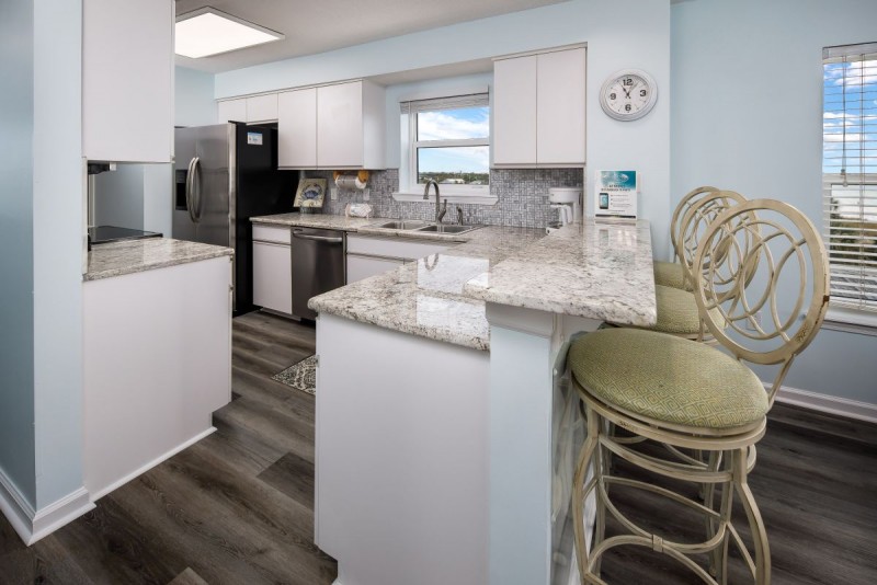 FREE PARKING AND FREE WIFI!!! An excellent, "Sunny," corner/end unit with a great overhead view of the boardwalk to the beach! Exceptionally furnished and well kept - this condo will make you feel right at home! Kitchen updated and looks AMAZING! High end stainless steel appliances, granite counter tops, marble backsplash will make cooking a breeze and the view will not let you forget you are in paradise!