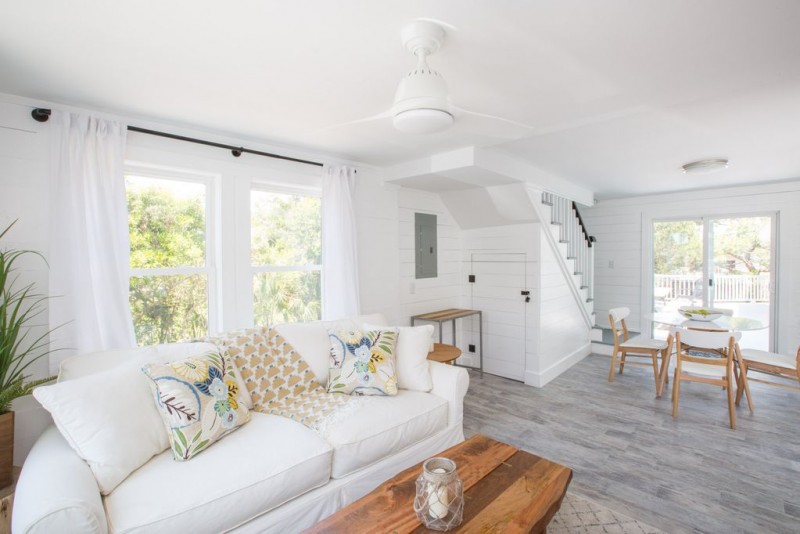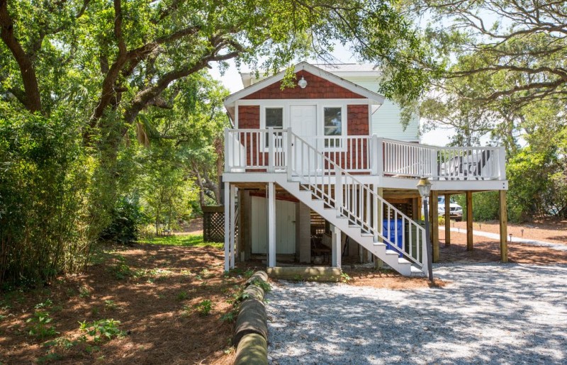 This freshly updated Folly Beach home located at 818 E Ashley Ave is just a block from the beach and sits on a high bluff, offering views of the ocean from the master bedroom. This charming home is on a huge street to street lot with large mature oak trees, plenty of parking, big deck for adults to chill and large grounds for kids to play and nice grill. Walk to the beach and enjoy an outdoor shower upon your return. Just two blocks away is one of Folly Beach’s public parks with a nice tennis court, pirate playground and mini skate park. Center Street Folly is only a 20 minute walk or easy bike ride to all the shops, restaurants and pier. The home has a nice big open kitchen, opening to the family room and living room with peak a boo ocean views. Enjoy the ocean breezes from the large wrap around decks. This home can comfortably sleep up to 8 (ideally 4 adults and 4 kids, but 8 adults if a few don’t mind a comfy pull out sleeper couch). There's a large master suite upstairs with vaulted ceilings, large private bathroom, and comfortable king bed. The second bedroom offers views of the garden and mature trees and has its own door to the outside deck and a Queen bed. The third bedroom or 'bunk room' has a bunk bed, the perfect spot for the youngsters to hang and sleep. There is a nice quality pull out sofa in the living room as well. All of the beach access on Folly is public and the closest access is less than a block away. If you’re looking for a fully updated home with privacy, large grounds, and easy beach access, this is the spot.