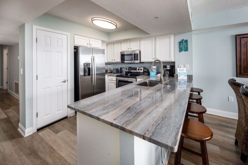 FREE PARKING AND FREE WIFI!!! PICTURE THIS: from the master bedroom, open the Floor-to-Ceiling glass doors and walk out on the private balcony with plenty of seating. Emerald water and white sand stare back at you, beckoning you to have a seat on the awesome, tall patio chairs and enjoy the calming sounds and scenes of the Gulf of Mexico! The living room also features balcony access so everyone gets to see the gorgeous view! This three bedroom, two bathroom unit features a fully equipped kitchen with stainless steel appliances, a breakfast bar, and granite counter tops. The living room and each bedroom has a SMART TV and free WIFI, which makes makes connecting easy! This unit has a laundry room with a full size washer and dryer for your convenience.