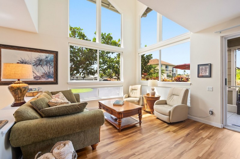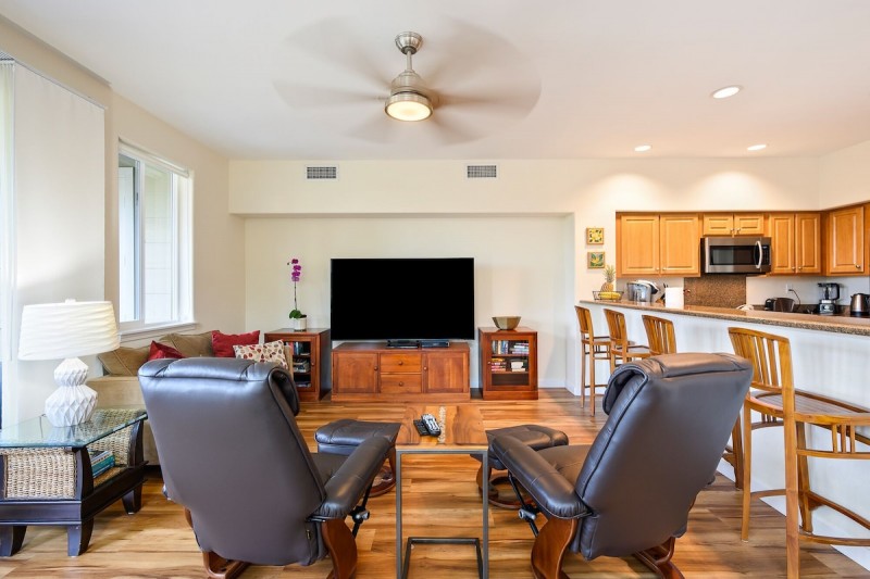 Parking is right outside the door, providing easy access with no stairs to climb. The ground floor has a guest bedroom and bath. Upstairs, you will find the main bedroom with private bath and private lanai. Upstairs you will also find a 2nd guest bedroom and bath as well as an office/den area. If you must work, the unit comes with high speed wifi and and the office area comes equipped with a desk and a beautiful tropical ocean view.