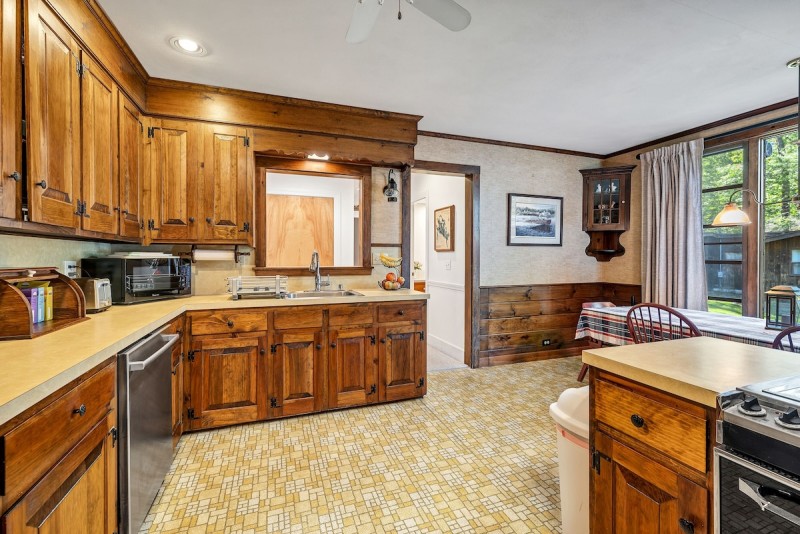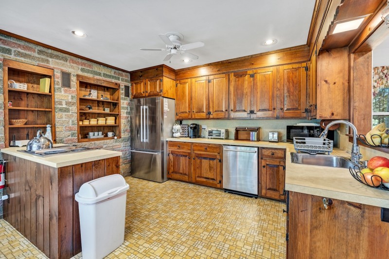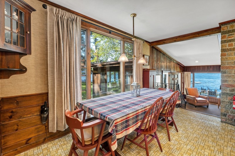 Inside, this four bedroom, two and a half bath lake home comfortably sleeps up to 10 people. There are water views from the sunroom, living room and primary bedroom. The first (primary) bedroom has a queen bed with ensuite bathroom. The second bedroom has queen bed. The third bedroom also has a queen. Perhaps best of all, the fourth bedroom is a custom bunk room with two sets of bunks (twin over twin, each).