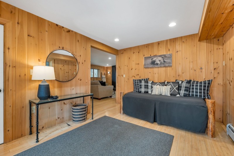Upstairs on the main floor, the open concept living area provides plenty of seating for both lounging and dining. The island bar is a great place to gather while the grill master of the group cooks up dinner on the large deck just outside the fully stocked kitchen, which has been updated with new stainless steel appliances. Don’t forget about the second deck off the dining area, which is where you’ll want to have your morning cup of coffee as you gaze out toward the lake and contemplate your plans for the day – the lake is close enough for partial views from the front deck. (Both decks are equipped with chairs, and there is a table on the deck off the kitchen.) On this floor you’ll find a queen bedroom and a bath with a shower – check out the heated towel bar, what a perk!