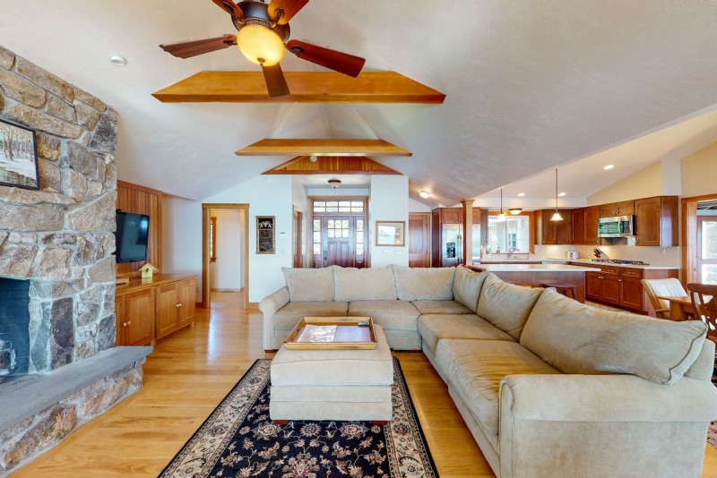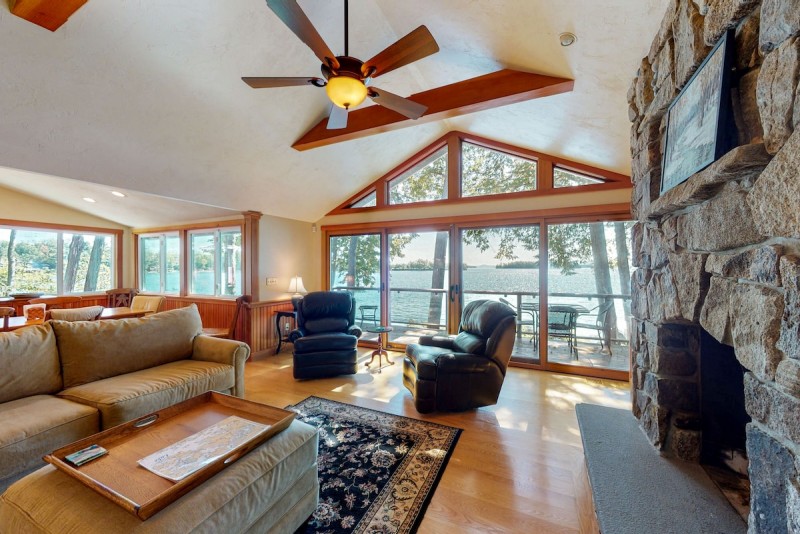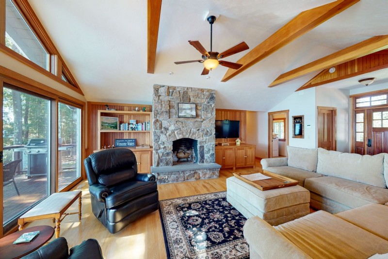 Spend your vacation on Lake Winnipesaukee at this 4-bedroom home with stunning views of Lake Winnipesaukee and the surrounding mountains. The open concept kitchen, dining area and living room give you spectacular views of the water all day long. Off the kitchen is a spacious screen porch with plenty of seating for outdoor dining. Down the hall are 3 bedrooms plus a den room for additional sleeping that has a TV in it. The den has a twin bed with pull out trundle. Across the hall is a full bath. The first bedroom has 2 twin beds, and the second bedroom has a queen bed. At the end of the hall is a spacious master bedroom with Queen bed, large bathroom with a walk-in shower. This bedroom also has it's own door that leads directly outside. There is also a laundry room near the kitchen with a second fridge.