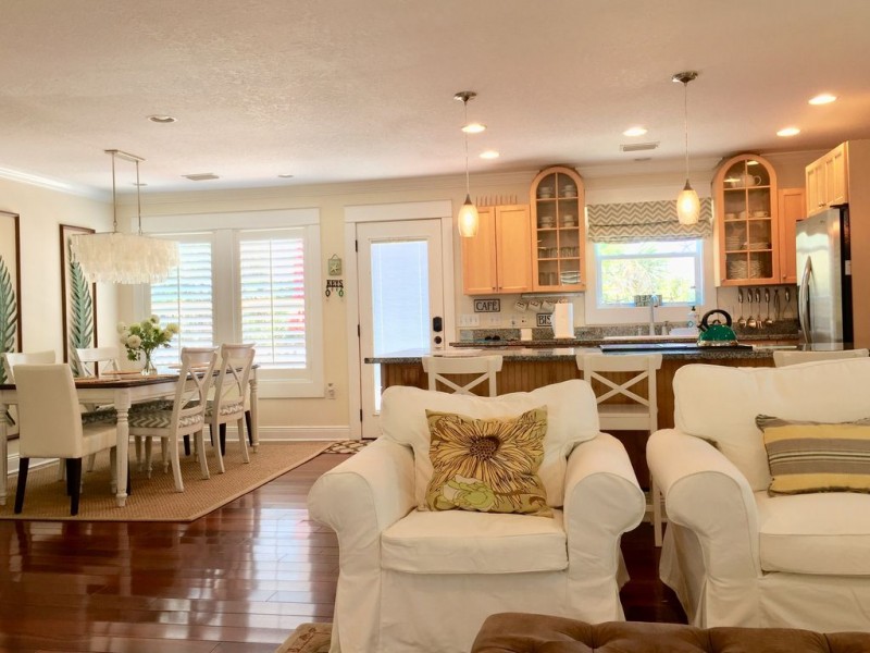 A Comfortable, cozy and clean home, located a short distance from the beach. This cottage is adjacent to a public pathway that leads directly to the beach, a short 2 minute walk gets you to the sugery white sands and warm emerald waters of Pensacola Beach. It has 3 bedrooms and 2 baths, with a large expansive wrap around deck. It is tastefully furnished and decorated in a relaxed beachy style, and accommodates 8 guests comfortably. The master bedroom is equipped with a California king bed and has a tempur pedic memory foam mattress for comfortable, and restful sleep, There is a 32" flat screen TV in the room and has a private bath. There are two additional bedrooms one with a queen bed and another bedroom with twin bunk beds and a daybed with trundle. The great room area is bright with lots of natural light. The living room, dining room and kitchen are all open and work well for entertaining. The kitchen is fully stocked and has everything one would need to prepare most any meal. The dining room and eat-in kitchen seats a total of 10. The wrap around deck is perfect for taking in Pensacola beach life, equipped with a gas grill , conversational seating, lounge chairs and a couple of rocking chairs. This home is ideal for a couple of families traveling with children or multiple generations of the same family. Come experience all that Pensacola Beach has to offer, while staying in a home that will feel like your "Home away from Home".