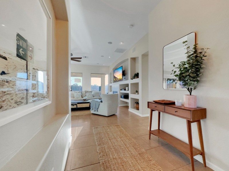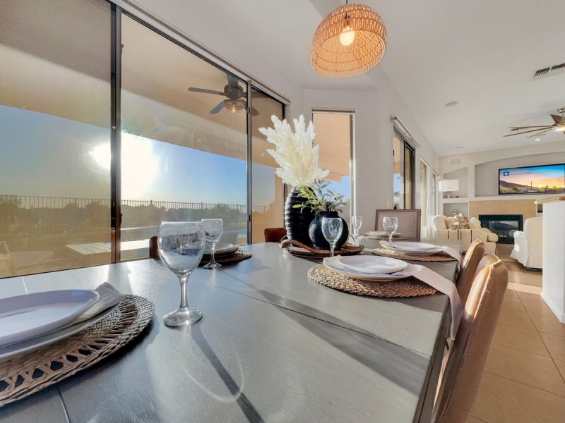 The popular split floor plan features a master suite at one end of the house with a plush king bed, a spa-like bathroom with a walk-in shower and a built-in walk-in closet. A large TV and sunny windows overlooking the professionally designed backyard offer an end-of-the-day sanctuary.