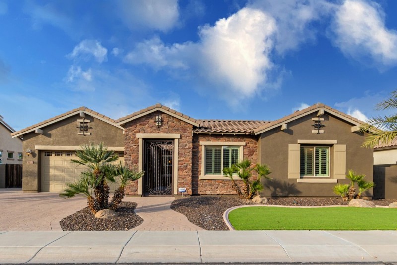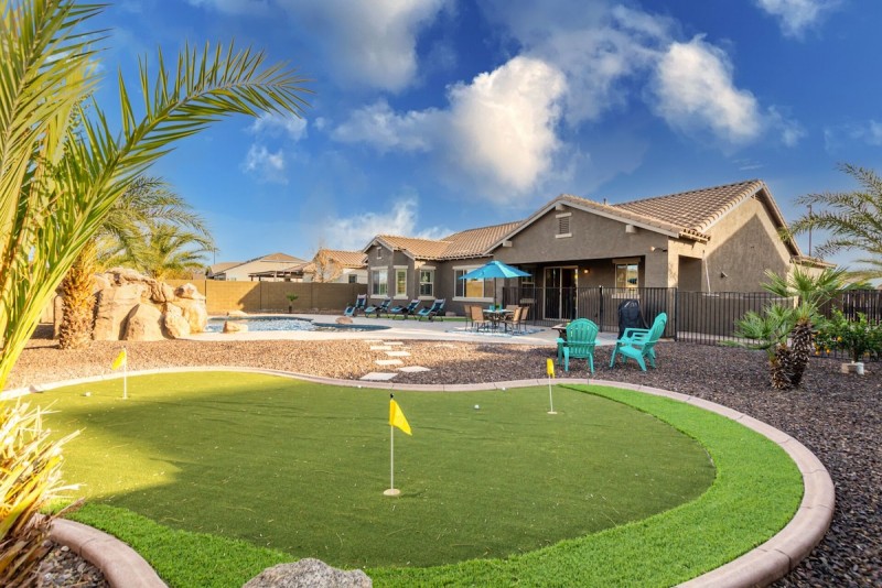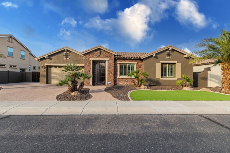 Step outside and be amazed. Enormous backyard with a safety gate for a little ones protection. Dining, gas BBQ, a putting green and a fire pit for enjoying the Arizona weather. Now the showstopper, a gorgeous sparkling pool with a grotto and slide. Don't pet. Hurry, this won't last.