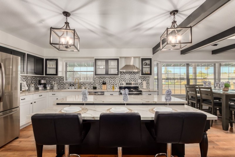 The entire home is light and airy with large windows looking in the large park like backyard. A large heated pool, with lots of loungers for soaking up that AZ sunshine. Large trees provide shade as well as the covered patio, with outdoor dining and a full outdoor living room. Perfect pool for kids with a basketball hoop and swing chair too. There are yard games in the large grassy area such as corn hole. Super fast wifi and an indoor laundry room will complete everything this home has to offer. You will never want to leave this spectacular home, it is vacation all in itself.