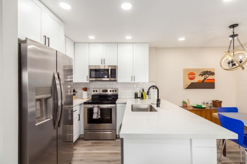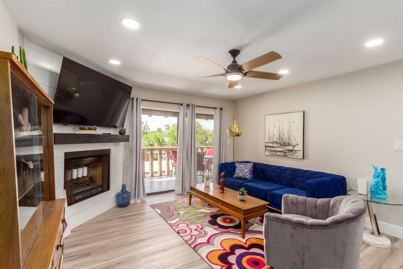 Super remodel in McCormick Ranch. 2nd floor with no one above you. Great views from the super sized patio to lush landscape. Parking ultra convenient with plenty of guest parking. Enter into a large great room open concept modern and wonderful living, dining and kitchen. The kitchen has white quartz, and a beautiful breakfast bar for entertaining or just socializing while meal prepping. It is fully stocked with everything you could possibly need, including a Nespresso coffee maker. The attached dining room has seating for 4 and can double as a workspace for your laptop etc. The living room is colorful and cozy with a fireplace and 65" Smartv with Hululive. Step out to the private balcony for outdoor dining or grilling on your electric BBQ. Just down the hall are two king bedrooms, one with an ensuite bath. Both have private televisions for enjoying the privacy in your own room. The hall bath and is just across from bedroom 2, so it is like having a private second bath. A full sized laundry room is in the is comfortable space too. There are 2 pools in the complex, heated with jacuzzis. Also tennis/pickleball courts. Private work out room with just enough equipment to get in a work out. The grounds are comfortable, well maintain and tree lined with grassy areas between. Walk to restaurants, coffee and even a brewery.