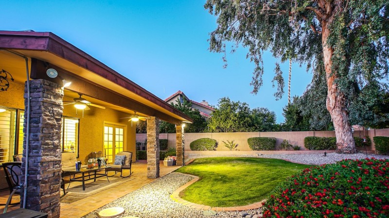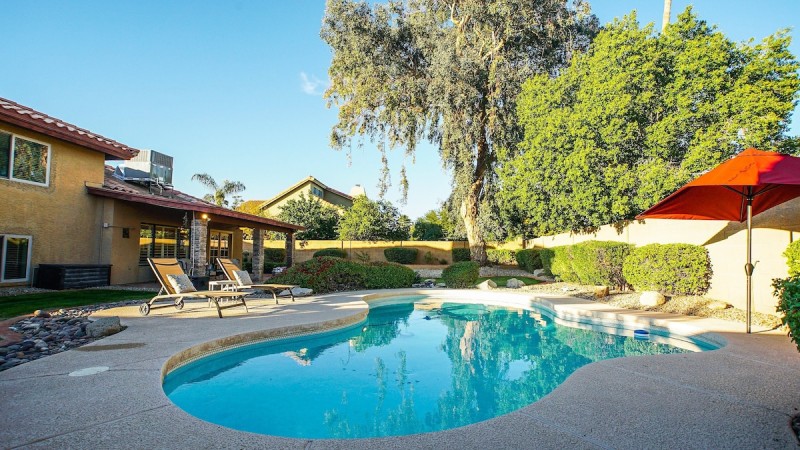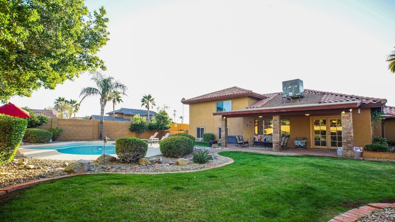 As you step outside you will be greeted by an enormous backyard with a glorious heated pool. Swim year round and enjoy the spectacular AZ sunshine. Loungers are available as well as outdoor dining and a gas grill. The grassy yard is perfect for everyone to play a game or cornhole or croquet.