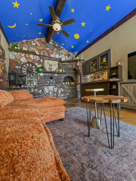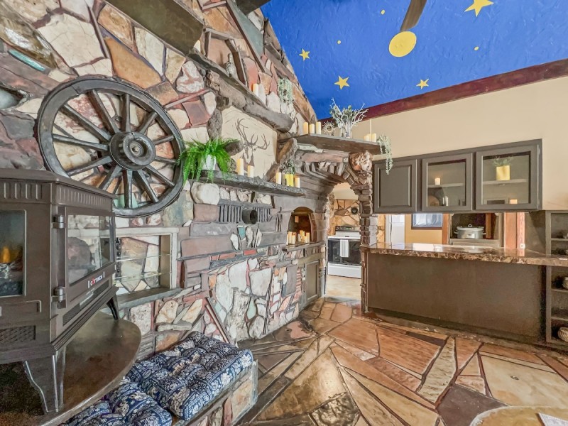 The details and fun begin the moment you walk in the front door - the pictures simply cannot fully capture the fun and nuances in this space. Moving to the living room, there is comfortable seating for all, a large screen TV that is streaming capable, and dining seating with large windows. Don't forget to look up for the highlight of this space! Wind your way through the secret door to find the kitchen with all new appliances and a drip coffee maker for your use. Commune with nature in the sunroom and enjoy the warmth of the day, regardless of how cold it may be outside.
