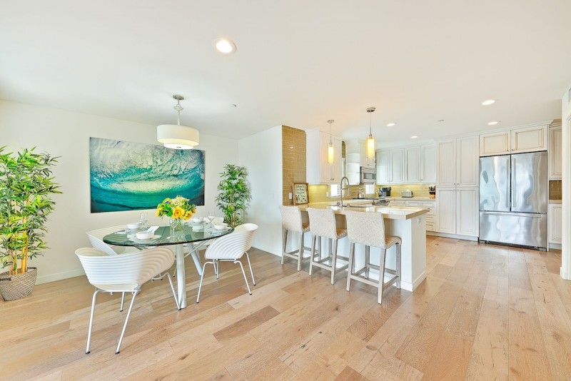 The 2nd level showcases a beautiful great room with a living room area with beach chic furniture, a large flat-screen TV, and a peak ocean view. A dining area for 4, plus a kitchen bar with 3-high top stools, ensures that everyone can eat together inside.