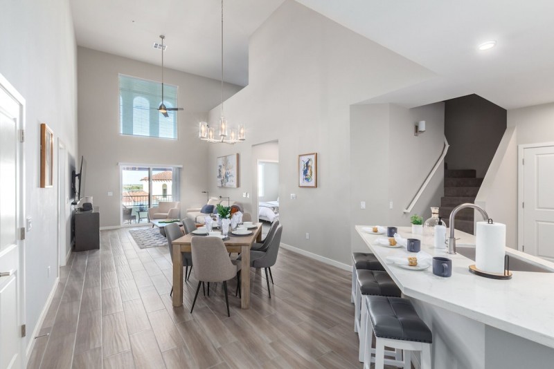 * Entertainment Haven: A chic dining area for six flows into a stylish living room featuring a 75" Smart TV and soundbar for an immersive experience.