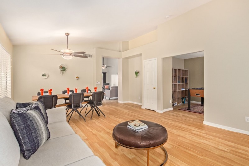 Inside, the spacious living and dining area greets you with a warm and inviting atmosphere. Off to the right, an office that doubles as a game room provides a private space for remote work or quiet relaxation, complete with closing doors for added privacy. The great room combines an open-concept kitchen, breakfast nook, and family room, creating a cozy gathering spot for the whole family. A super-sized smart TV is perfectly positioned for viewing from anywhere in the room. The fully equipped kitchen includes a breakfast bar for casual dining or entertaining, making it easy to prepare meals or get ready for a backyard BBQ. The home also offers super-fast WiFi and a laundry room for added convenience.