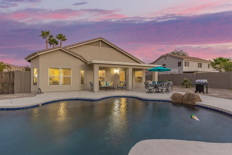 Outside is the perfect place to unwind. The west facing backyard will amaze you with the Arizona Copper Sky Sunsets. Take a dip in the sparkling pool, BBQ, dine al fresco or lounge under cover with an evening beverage. The pool has a slide for extra fun.