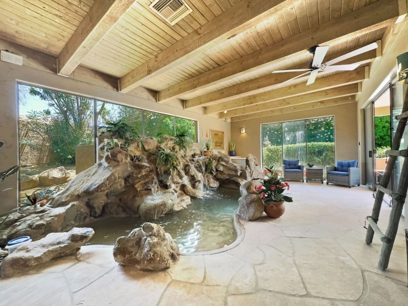The second bedroom is no less impressive with its king-sized bed and views of the cactus garden outside. Bedroom 3 features a queen-sized bed and TV while Bedroom 4 has two XL twin beds that can be converted into a king if needed. These three bedrooms share a hall bathroom with double sinks and an enchanting grotto shower surrounded by a beautiful cactus garden- perfect for any nature lover!