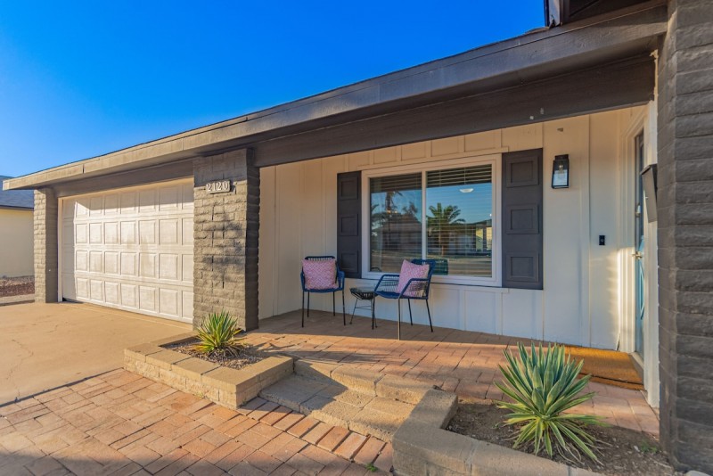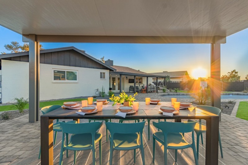 Welcome to the Sunny Desert Oasis, a beautiful retreat nestled in the heart of Tempe, designed for relaxation, entertainment, and remote work needs. This newly furnished 4-bedroom, 2-bath home features a spacious open-concept living and dining area, high-speed internet, and a dedicated workspace, making it ideal for work-from-home professionals and families alike. Step into the oasis-style backyard to find a large heated pool, perfect for year-round fun, surrounded by lounge chairs, a hanging chair, and a covered patio complete with a smart TV and a dining gazebo for ten. Inside, the remodeled living room welcomes you with a cozy, oversized sectional, plush velvet chairs, and a 75” TV equipped with HuluLive, ideal for movie nights or sports marathons. The modern kitchen, seamlessly integrated with the dining area, boasts a dining table seating ten and a fully stocked kitchen for culinary adventures. The innovative pass-through kitchen window doubles as a bar for effortless serving to the patio area. The primary bedroom offers a luxurious king bed, ample closet space, and an en-suite bath, while all bedrooms ensure comfort with memory foam beds and smart TVs. Bedrooms two and three feature queen beds, and the fourth bedroom offers two queen beds, accommodating everyone in style. Beyond the French doors, enjoy the lush backyard with its sparkling pool, lounger chairs, and an array of outdoor games like corn hole and ping pong, making it a paradise for families. Amenities for little ones include pack and plays, a high chair, and more, ensuring a seamless stay for guests of all ages.