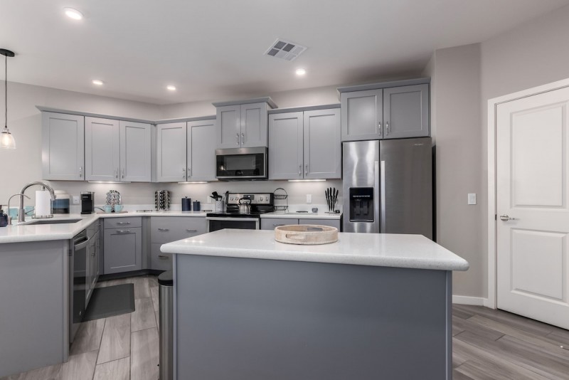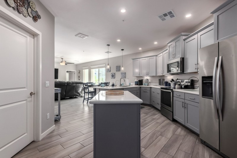 The Kitchen provides an open floor plan to the living room with 4-star quartz breakfast bar, separate island, walk in pantry and all the cooking utensils for gourmet cooking inside and out. The living room provides upgraded brand new furniture so that you can enjoy your 4K SMARTV. There is also a flex space office for your private use. A dining room with seating for 4 and the breakfast bar make this great room comfy and cozy with plenty of seating. Your full-size laundry room and powder room off the entry completes the living area.