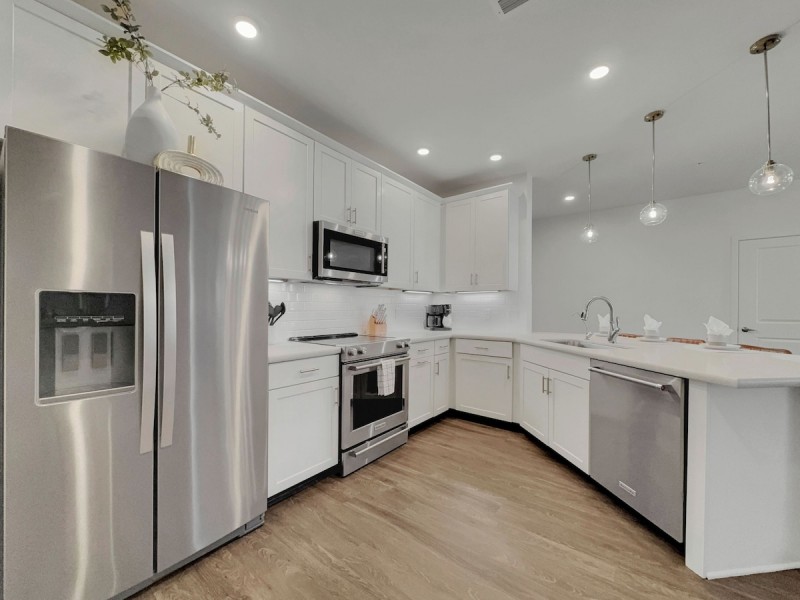 Our well-appointed kitchen features stunning quartz countertops, a breakfast bar, custom cabinetry, a spacious pantry, and stainless-steel appliances. With 1350 square feet of open-concept living space, you'll enjoy a welcoming dining area and a cozy living room equipped with a 65" Smart TV and high-speed WiFi. The split floor plan ensures privacy, with a Master Suite offering a king-sized bed, another TV, and an exquisite en-suite bathroom with double sinks, a walk-in shower, and a walk-in closet. The second bedroom also features a king bed, a walk-in closet, and a hall bath. A dedicated office space in the master bedroom and a full-size laundry room add to the convenience of your stay.