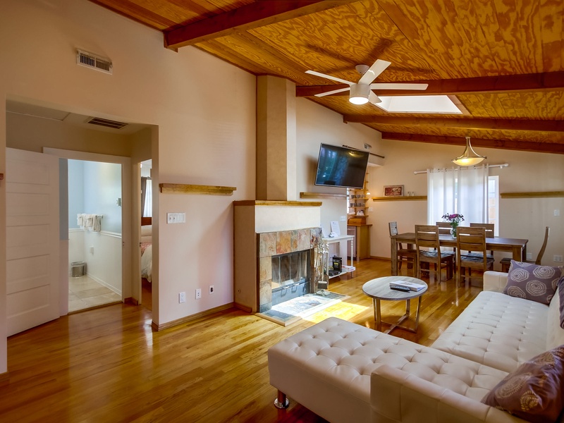 The living room is spacious with a fireplace, HD TV, Cable and WiFi. There is a bean bag that converts into a full size bed.