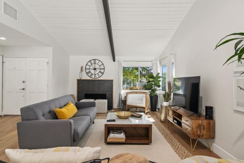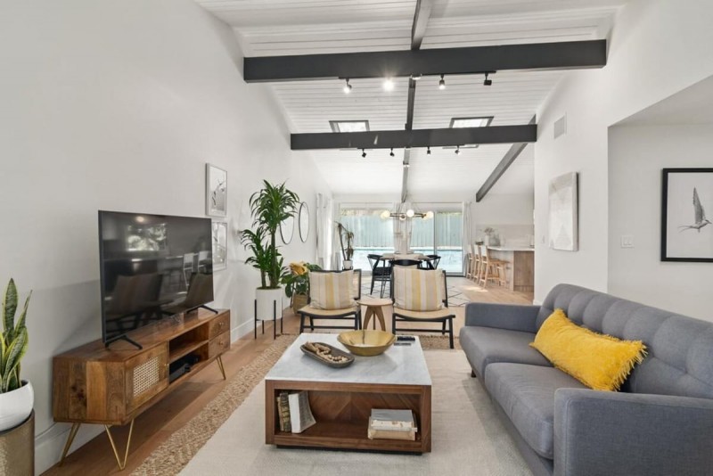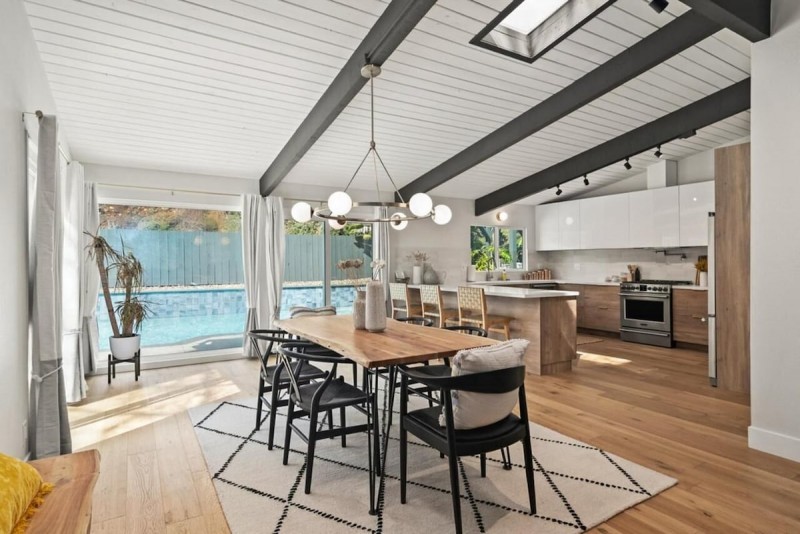 An unforgettable stay awaits at this stunning vacation home, developed by famed architect William Krisel. The original mid-century modern aesthetic combines seamlessly with contemporary coastal elements to create a true masterpiece. Highlights include a designer chef's kitchen, high ceilings, and impeccable finishes throughout. Your luxe backyard paradise is complete with a gas grill, an inviting fire pit, and a saltwater pool. The open layout allows for effortless indoor/outdoor entertainment.