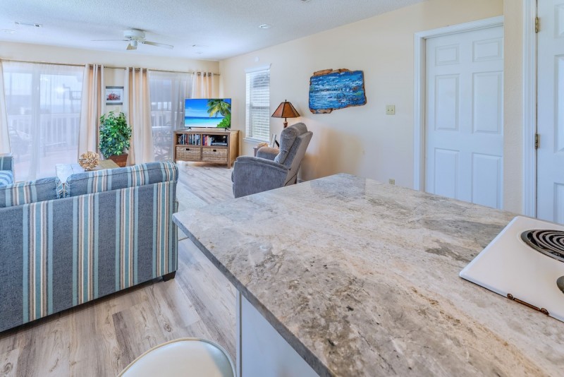 Well decorated with area pictures and appropriate decorative furniture. (full sofa, love seat, recliner, coffee table, book shelves, chair side tables, and coffee table) Full wooden hurricane blinds on all windows. Well stocked with books to read and games to play.