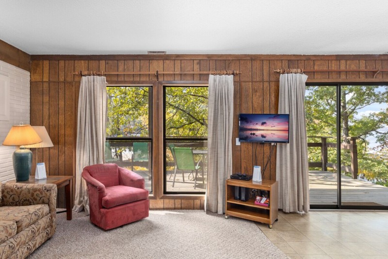 This 2 Bedroom 2 Bath waterfront Lone Oak Point Condo features a wonderful parklike view and just steps from the lake! You enter into the dining area that has seating for 4 and is open to the kitchen and living room with large windows to enjoy the view. There is a TV and Wi-Fi to stay connected.