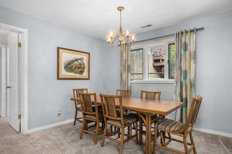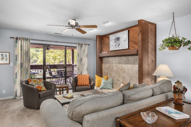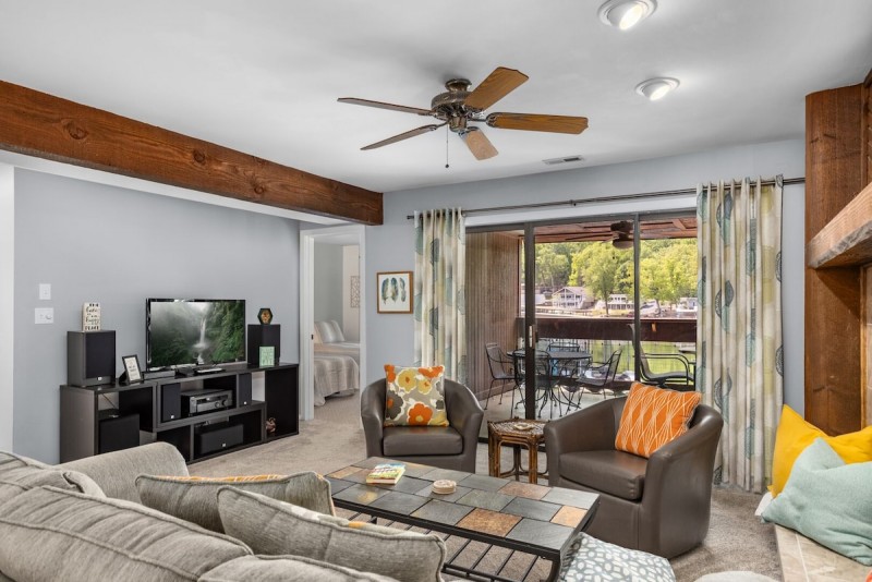 Located at The Knolls Resort down KK in Osage Beach, this 3 bedroom, 3 bath waterfront condo offers great accommodations with awesome amenities! Walk into the dining room featuring a 6-top table, with 3 additional seats at the breakfast bar. Enjoy a full kitchen with all major appliances and plenty of cooking utensils and dishware. The living room features a couch and two chairs, with a flat screen TV and stereo.