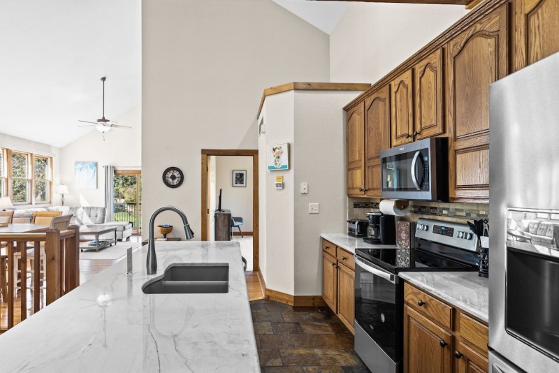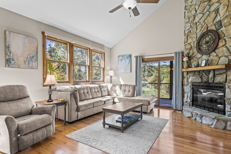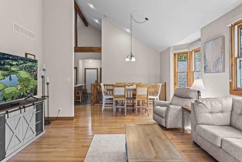 Stepping inside you will find the living room with sectional and recliner, large TV with cable and plenty of windows with access to the deck.