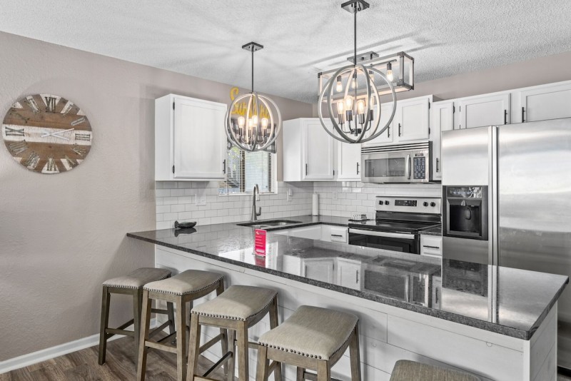 Everything you would need in the kitchen is included: full sized refrigerator, microwave, range, dishwasher, blender, pots and pans down to the silverware, with extras like a coffee grinder and crockpot. Guests can dine with five at the breakfast bar and two at the bistro table. Deck has a gas grill and seating for four.