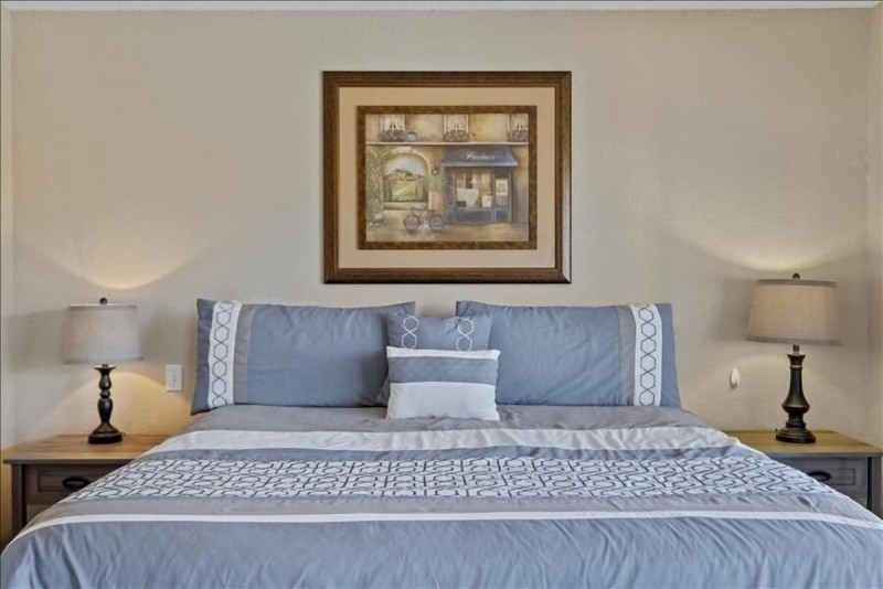 The second master bedroom features a king bed, private bath and deck access. The fifth bedroom features a queen bed.