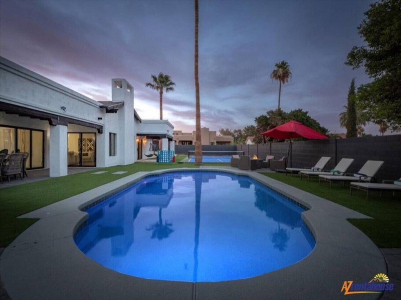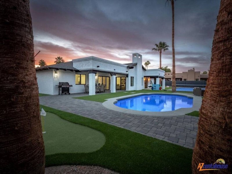 As soon as you open the door, prepared to be wowed. Among the lavish backyard space, the interior luxuries match the quality and will surely not disappoint. Everything is new here and custom designed by an professional deisginer from furniture, beds, cutom pickleball court, putting green, & more. We carefully designed this home to comfortably accommodate small or larger groups. This resort backyard is tastefully equipped with new high-end patio furniture, large BBQ grill This 2,600 square foot home is perfect for your large group with 4 bedrooms and 2.5 baths. On the inside we have two spacious living areas for entertaining, completely remodeled in this home has all new furniture, 4k TVs, brand new bathrooms with plush towels, luxury beds and linens and a kitchen equipped with everything you might need for a delicious meal at home. This Airy & open floor plan featuring chef's kitchen, beautiful modern upgraded finishes and designer fixtures. The outside is a private poolside oasis surrounded by palm trees that is great for endless fun in the sun! This prime Scottsdale home has everything you need for your desert getaway. Sip your morning coffee (or mimosa) draped in a comfy lounge chair in the spacious yard, or mounted on a float in the pool. Get lit by the fire-pit, throw some tasty meat on the BBQ, toss a few bags on the pristine turf, or slap some balls at the ping pong table Minutes away from the best entertainment options, restaurants, biking trails, golf, spas, hiking, shopping, TPC Golf and more! ,, a ping pong table, spikeball, connect 4, corn hole, Large glass door leads out to resort style backyard, private pool, outdoor dining and panoramic views!