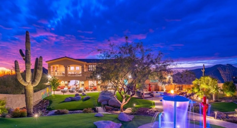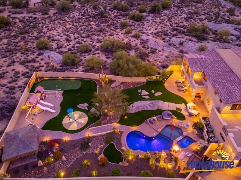 Two story open floor plan features 5 bedrooms and 3.5 bathrooms. (Sleeps up to 16). Several rooms feature huge, floor to ceiling windows which provide breathtaking & picturesque mountain and city views throughout the estate. and within minutes to world-class golf courses, this North Scottsdale location is the perfect vacation home