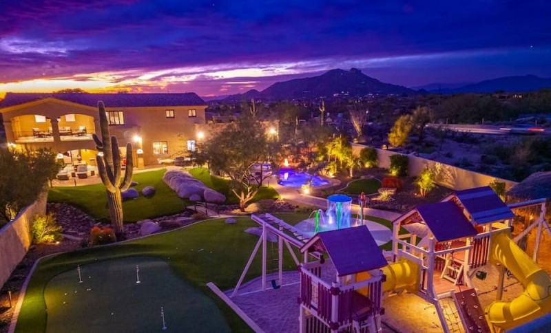 The entire property was just recently remodeled. Everything is top of the line. This is Disneyland dream Resort backyard is packed full of activities for adults and kids of all ages. Activities include a splash pad with led lights, and 3 different water features, 5 putt putting green, with a separate chipping green off front of house, fire features by pool, heated pool, massive hot tub, pool table, corn hole, foosball, Tiki hut custom with misting system, lighting and fan, Children's castle playset, outdoor eat up BBQ, 2 massive roof decks with views across the entire city, Mountain views from every room in the house, tons of outdoor seating, 4 lounge chairs, 1 resort day beds. This back yard is your resort away from home!