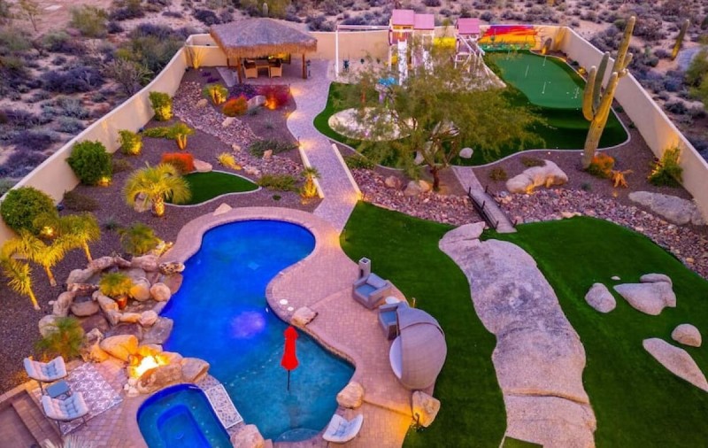 this place has something for everyone. If you're a golfer you're guaranteed to love this backyard. You'll find the custom putting green so you can work on your short game. When you're not working on your putting you can practice with your drivers and irons off the custom chipping green off the front of the house1 to get ready for the big leagues. You can also practice your hand-eye coordination with a game of pool.