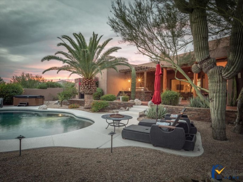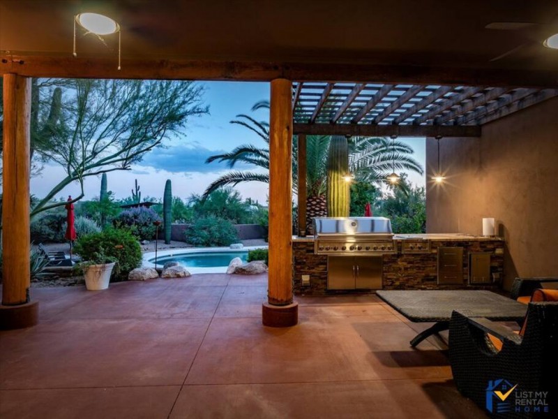 Welcome to our beautiful North Scottsdale home. This tropical yard is a dream! The backyard features a Pool & Hot Tub, Custom Shuffleboard, Putting Green, Outdoor Fire Pit, glass pocket sliders, covered patio w/seating & dining, Outdoor Tv, outdoor shower & plenty of areas to hang out & soak up the sun! You'll never want to leave! This beauty & balance creates a luxurious, tranquil oasis for visitors to relax, refresh & recharge, offering personalized indulgences tailored to cater to every whim