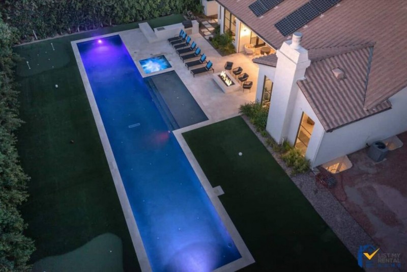 Enjoy the spacious backyard lush at the luxurious Desert Oasis w/ mature palm trees! The look & feel of a 5* resort complete with this massive LAP private pool and spa,(heated) baja step for kids, indoor billiards table, 2 putt putt courses, indoor & outdoor fireplaces, tons of lounge chairs, lots of seating to relaxing and dine, built in BBQ, large covered patio. It rests on a large private lot This is truly a remarkable home and the perfect getaway in Arizona! ! Enjoy now