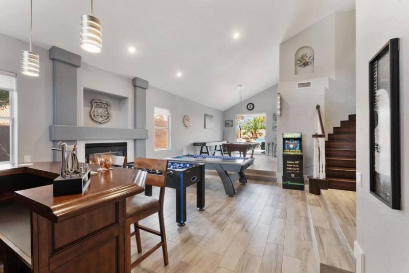 The backyard retreat is an entertainer's dream, rivaling any resort in town. The covered patio offers a spacious dining area and outdoor TV. Featured amenities include a sit-down arcade, sparkling pool, spa, and fire pit. This property was furnished and designed by a professional.