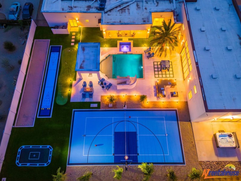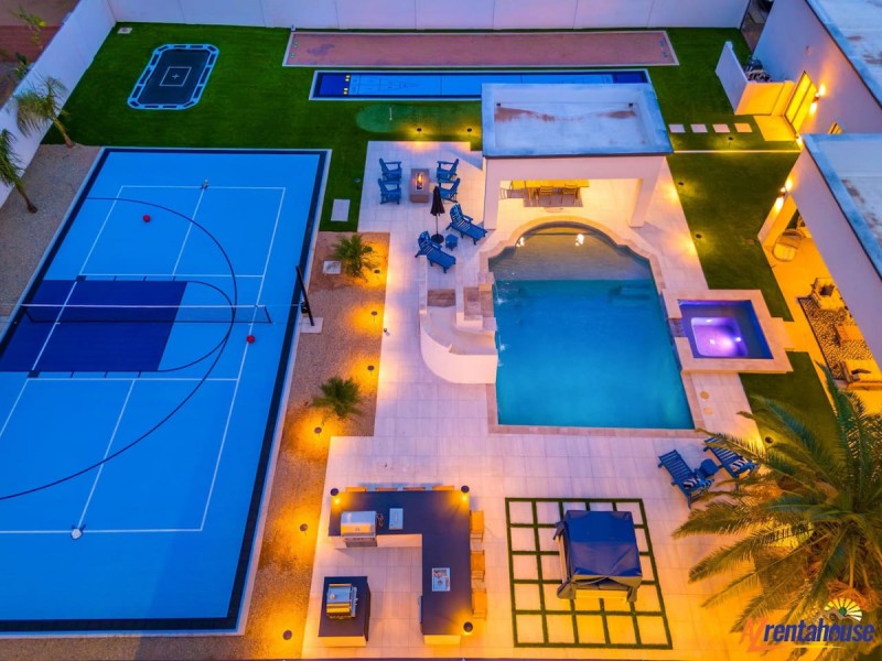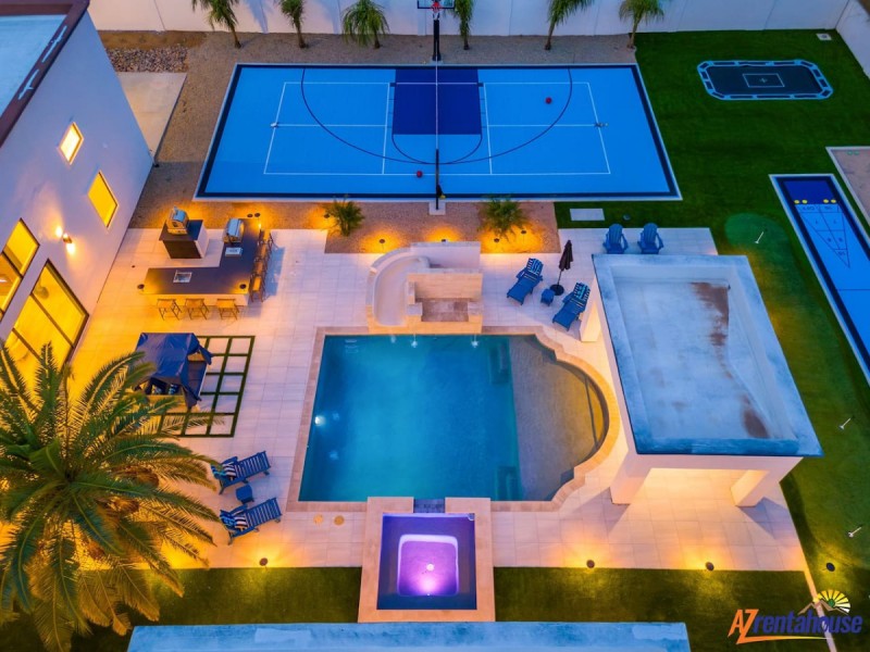 Welcome to Luxury Living at its finest private Bell Tower mansion with a resort-style yard! a private resort perfect for an unforgettable valley vacation! Come enjoy our Magnificent Estate in Scottsdale's most coveted location. This breathtaking estate offers an exquisite experience like no other. This luxurious 7-bedroom, 4.5-bath, With professionally-selected décor, this one-of-a-kind luxurious home is custom-designed for large groups to experience extravagant living in Scottsdale. This upscale designer home comes with style and elegance. Immerse yourself in the brand-new 250,000 renovations where the owner spared no expense and furnishings that adorn every corner of this remarkable space. . Immerse yourself in the tranquil ambiance of the backyard oasis, where you can unwind by the custom-made waterslide with customized veneer tiles and water descent, catch your favorite game on the outdoor television, perfect your short game on the 4 hole putting green, engage in lively pickleball matches, friendly game of shuffleboard, jump off some of your energy with our custom inground trampoline, or indulge yourself in the cabana, shielding yourself from the desert sunshine., your exquisite oasis awaits in the heart of Arizona. Experience, where every detail has been thought out. This spacious, sunlit desert home is filled with upscale amenities. The full gourmet-style kitchen is fully stocked with all your essential cooking needs, perfect for satisfying your cravings for a delicious home-cooked meal.