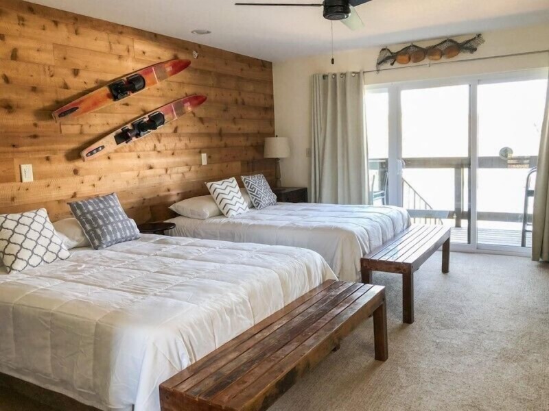 Two of the Three bedrooms feature a Queen bed and a TV in both. One bedroom has 2 Queen beds, a TV, and deck access.