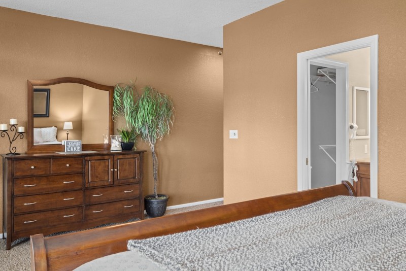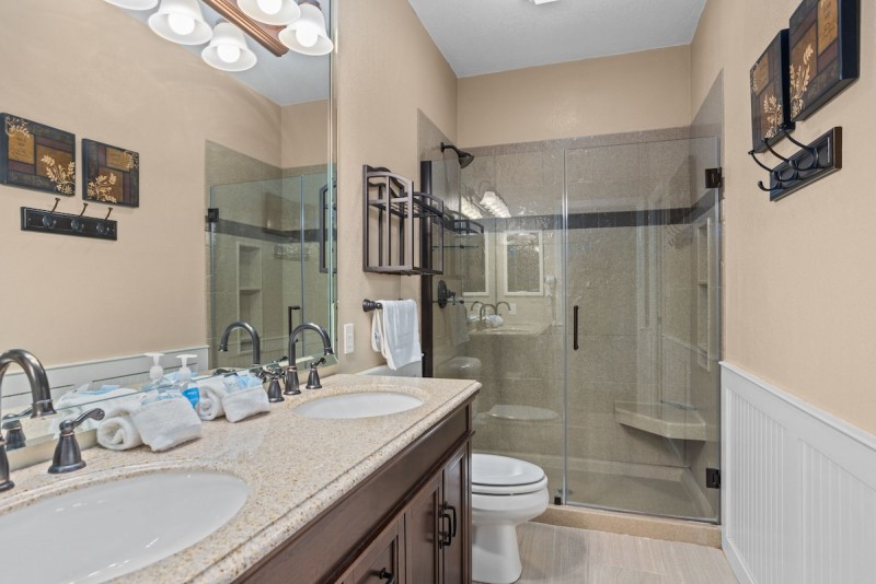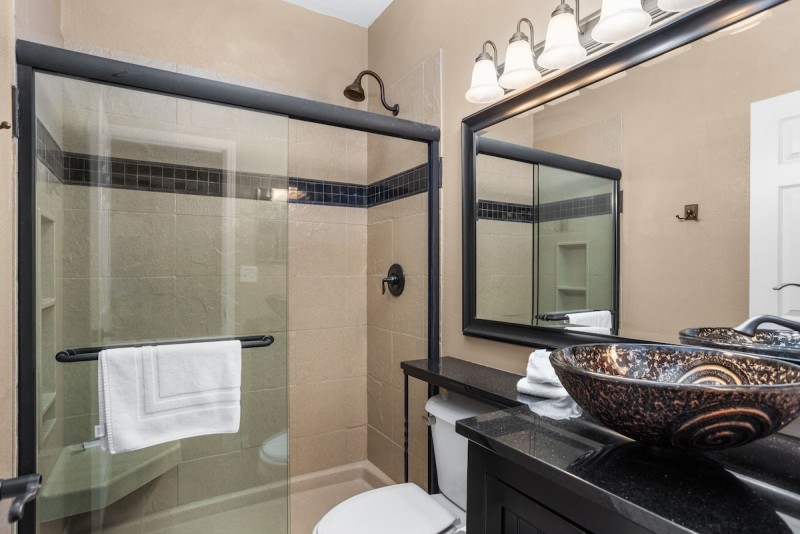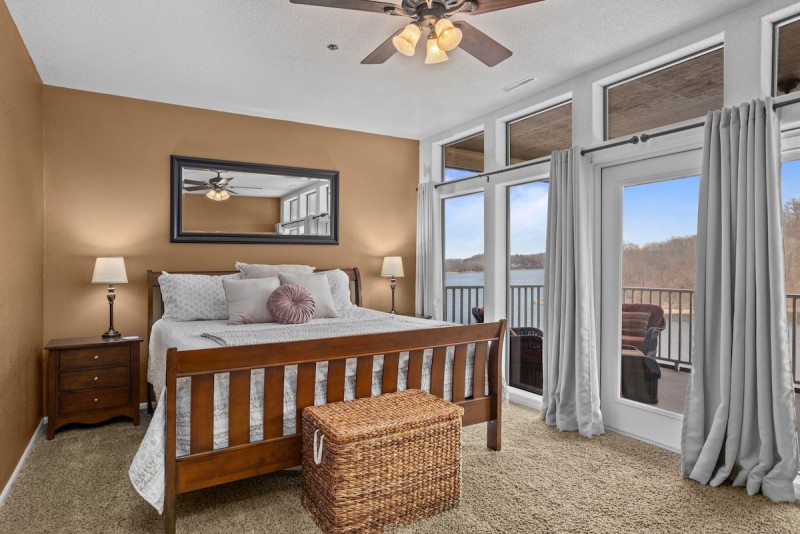Lakeside master bedroom includes a King size bed, ceiling fan, deck access with a wall of windows and a private bathroom. Bathroom includes a walk-in closet, glass enclosed shower and double sinks. Bedroom 2 has a Queen bed, ceiling fan and private bathroom. Bathroom includes Tub/shower with shower door and single sink. Bedroom 3 accommodates a Queen bed, ceiling fan and closet with access to the third bathroom in the hallway. Hall bath includes a glass enclosed standing shower and vessel sink.